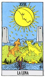 La Luna se conecta profundamente con el agua. No solo por las imágenes de la luna. En esta carta vemos la langosta, la vida del océano saliendo del agua para emprender el camino hacia lo desconocido. Un charco de agua en esta carta puede representar un espejo, una forma de reflejar lo desconocido, el subconsciente y la naturaleza oculta de la magia para nosotros. También puede representar conocimientos ocultos o los misterios esotéricos del agua que son desconocidos para muchos.